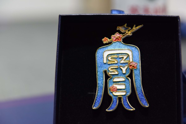 小讲解员将景之蓝文创结合实验学子创意特制的校庆珐琅徽章赠送给现场嘉宾,并介绍道:“校庆徽章整体结构采用繁体篆书‘实’字,结合传统冰梅纹样,庄重典雅,富含文人气息 。中心镌刻SZSY窗棂造型,四朵梅花象征深圳实验学校建校四十周年。枝头飞来的燕子,寓意‘实验之路春常在’。”陈蓉老师补充道:“珐琅工艺需经几十上百道工序,正如实验四十年磨砺的教育匠心。”此时,烤箱中渐变的实验蓝、浓郁的翡翠绿……已如凤凰涅槃般浮现。孩子们举着刚出炉的徽章跑来,未冷却的釉彩在他们掌心流转,五光十色,恍如捧着一汪凝固的星河。