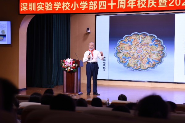 当大屏幕亮出【松石绿龙首抱月瓶】上的福寿纹,邱老师声音陡然轻快:“这蝙蝠衔着寿桃叫做“福寿纹”,今天咱们借来给实验庆生——祝福深圳实验学校40周年福寿双全,青春永驻!”