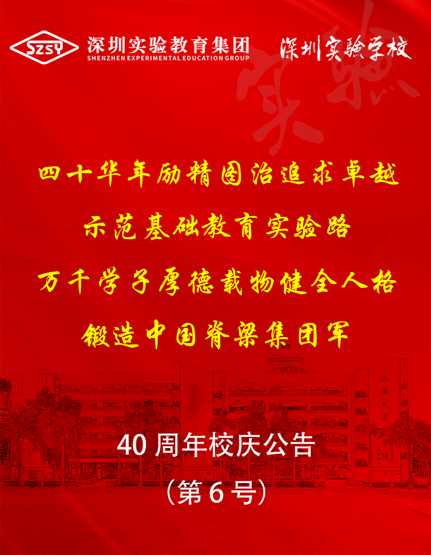 2025年5月3日,我校将迎来建校四十周年校庆纪念日。为弘扬实验精神,传承实验文化,铭记实验人为党育人、为国育才,开拓创新、培根铸魂的辉煌业绩,我校于2024年3月发布了《深圳实验学校40周年校庆主题歌词、实验赋征集启事》。