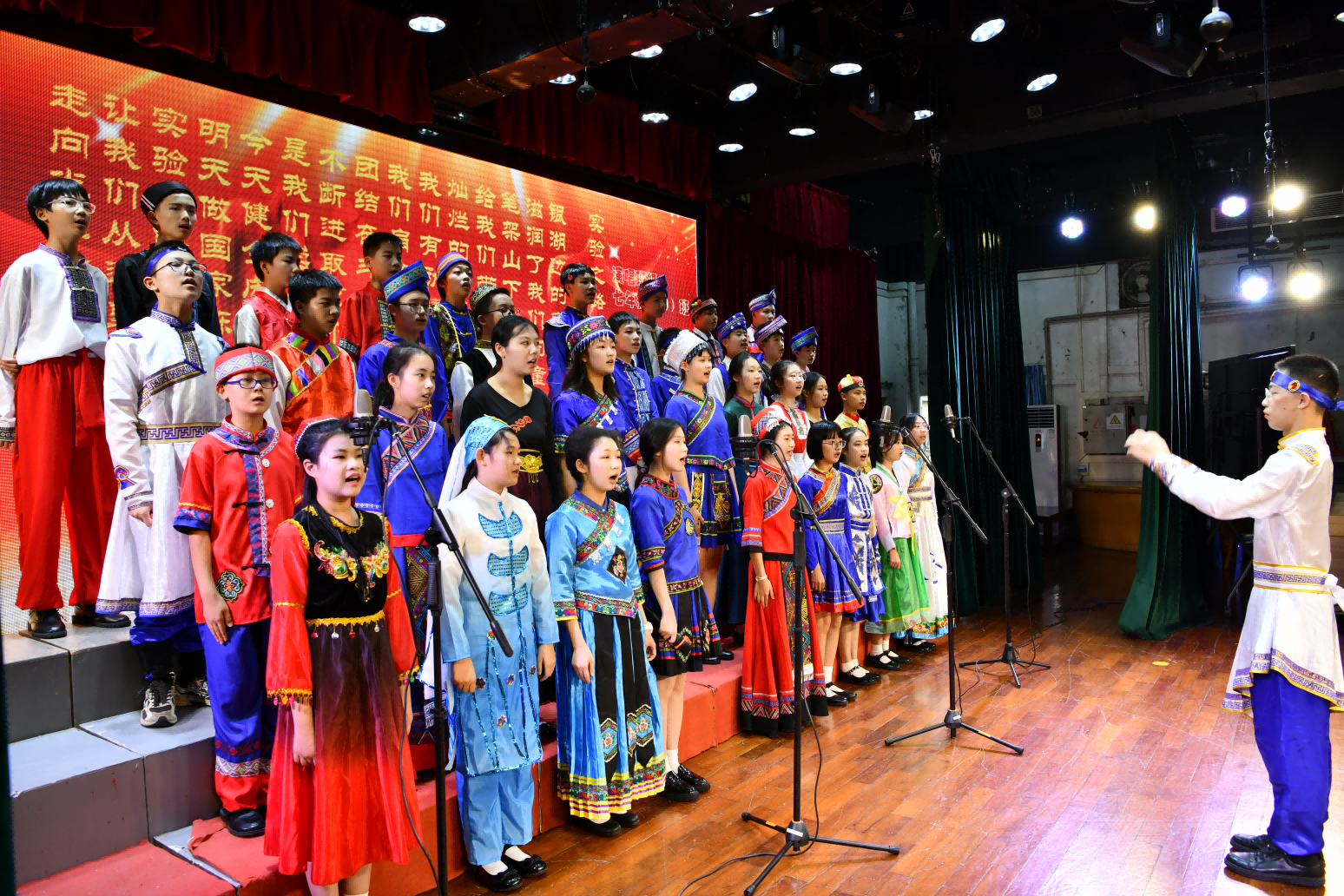 七(10)班同学精彩演绎了《爱我中华》,每位同学都身着具有民族特色的服装,代表着我国五十六个民族相亲相爱、团结共处,活泼的语调中也流露出对祖国的热爱。