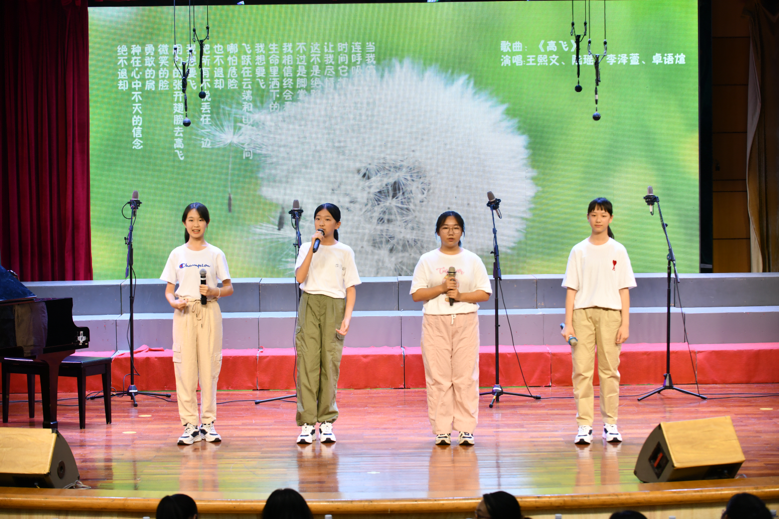 随后七(2)班王熙文、陆瑶、李泽轩和七(5)班卓语煊同学为大家带来了精彩的表演《高飞》。她们的演唱振奋人心,充满了正能量和希望,也激励了同学们面对困难,要保持永不退缩的精神。