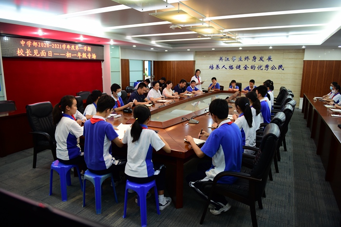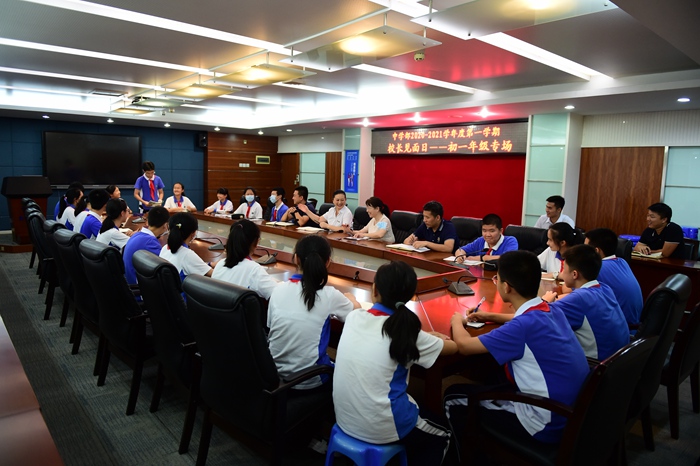本期“校长见面日”主要面向2020级初一新生,会议在轻松愉快的氛围中展开。在场的各班学生代表在会议之前,积极收集了班级同学们的问题与建议,就学校的教育教学、学生管理、课外实践活动以及阅读等方面踊跃发言,同时提出了一些建议。