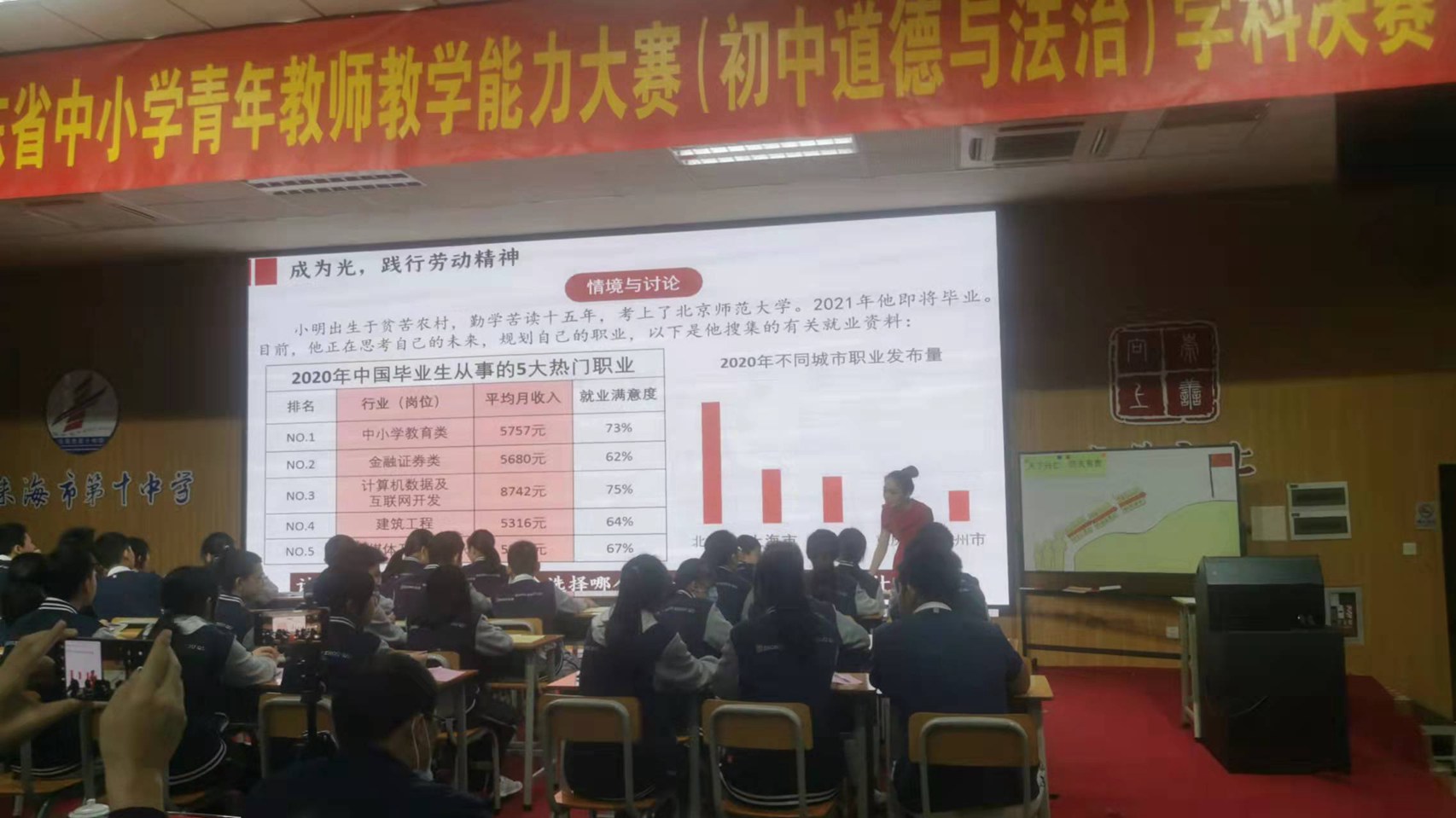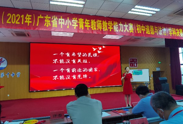 第二轮是在珠海市第十中学进行现场时政述评。赵曼琳老师从容淡定,从新中国初期抗美援朝血战长津湖的志愿军讲起,回溯近代投身革命的先贤孙中山、李大钊等仁人志士,再讲到当今为国争光的奥运健儿和航天英雄,一个个英雄的故事引导青少年深入思考英雄们的正确“打开方式”,带领学生走进英雄,读懂英雄,成为英雄!第一轮和第二轮的得分相加排序,全省22名选手只有总分进入前10的才能晋级第三轮比赛。经过激烈的角逐,赵曼琳老师脱颖而出,以绝对的优势进入第三轮。