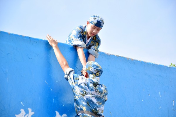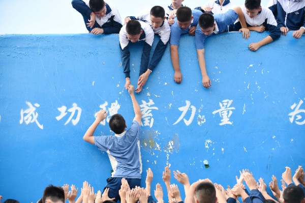 在团队浮桥活动中,同学们用双肩扛、用双手托起同学,将一位位队友渡过彼岸。在挑战三米高的“成功墙”时,经历五次“重新再来”,同学们不言放弃,齐心协力,用自己的全部力量将所有同学推举、拉上成功墙。特别是最下面的两位同学,他们跪坐着当人桩,咬紧牙关,承受重压和疼痛,不放弃任何一位同学。泪水和欢笑交织,温暖与友爱凝结。