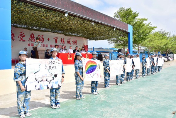 五天的时间里,我们看见了同学们参加队列训练后更加健壮的体魄;也看见了同学们在结营仪式上目光坚定,口号响亮,脚步铿锵;还看见同学们更加团结,更加热爱班集体,更尊重别人的付出。过去,我们曾抱怨内务难整,床单难铺,而今天,却是整理得井井有条的内务,床铺;过去,我们曾感慨军人的严整难以企及,但经过这次团队拓展训练,一个个默契的团队,上演着一场场震撼的队形,接受检阅。