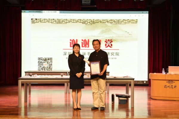 4月22日下午4:00,“指画艺术讲座”在中学部小礼堂如期开讲。同学们首先观看了由深圳市委宣传部为王和平老师制作的“指画”宣传片,让同学们对指画艺术的历史渊源有了初步的了解。在接下来的环节中,王和平老师进行了指画的基本技法介绍。为激发同学们的兴趣和增强直观感受,王和平老师还给同学们现场表演了“手指书法”。同学们争先恐后来到讲台,簇拥在王老师身旁,观看中国四大国粹之一的书法,是怎样用五根手指生动地挥洒出来的。王和平老师用大拇指沾了沾墨水,挥手写下“立德树人 铸魂育人 ”八个大字。