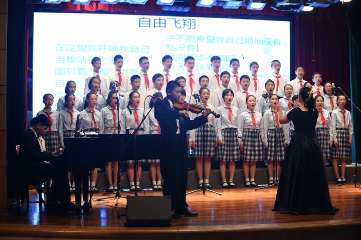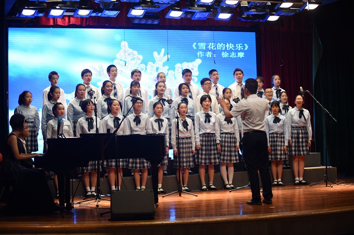 初一(8)班同学的《青花瓷》,合声优美,微笑陶醉,令我们沉浸在美好的歌声中;接下来是(5)班的《四季的问候》,歌词清新,旋律悠扬,表现了追梦少年们的执著;(6)班《在灿烂的阳光下》,吐词铿锵,精神饱满,动作整齐划一,使我们感受到了别样的爱国情怀;(1)班的《大鱼》蕴藏的深情使我们久久回味;(3)班的《当你老了》则带给我们对父母深深的感恩;(2)班的《芦花》和四班的《乌苏里船歌》又把我们带回了烽火硝烟的时代;(7)班同学演唱的是《自由飞翔》,优美的旋律,投入的情感,让我们察觉了歌声中美好的意境;校合唱团的两首歌《从前慢》及《雪花的快乐》更让我们明白了音乐的美,艺术的美。