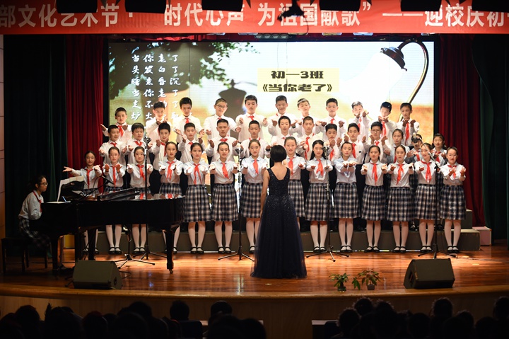 在整个合唱比赛中,同学们沉浸在优美的旋律之中,遨游在艺术的海洋之中,为实验、为祖国献上了款款深情和深深地祝福。(文/初一7班任乐奕 图/电教室)