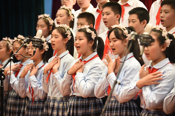 五月五日下午,五楼小礼堂洋溢着节日的气氛。初一的男同学穿着整齐的服装,女同学化着淡淡的妆,青春的脸上洋溢着期待和喜悦,放歌高唱,祝福实验,祝福祖国。