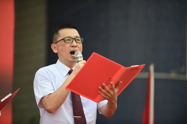 7时50分,升旗仪式开始。“送——旗!”“旗”音一落,《歌唱祖国》的音乐奏起,全场肃穆;步履矫健、英姿飒爽的旗队,高擎着五星红旗沿着长长的红色跑道,径直走向旗台。伴随着雄壮的《义勇军进行曲》,迎着清晨太阳的光辉,鲜红的五星红旗在师生和家长的注视下,在全体师生高唱国歌声中,冉冉升起,飘扬在中学部校园的上空。