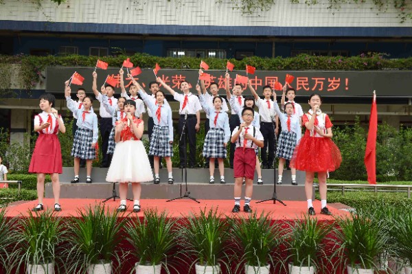 “送旗!”伴随着《歌唱祖国》歌曲的旋律,鲜艳的五星红旗在6名护旗手的护送下,迈向升旗台。“升国旗,唱国歌!”全体师生行注目礼,少先队员敬队礼,高唱国歌。