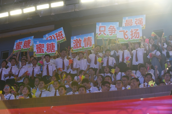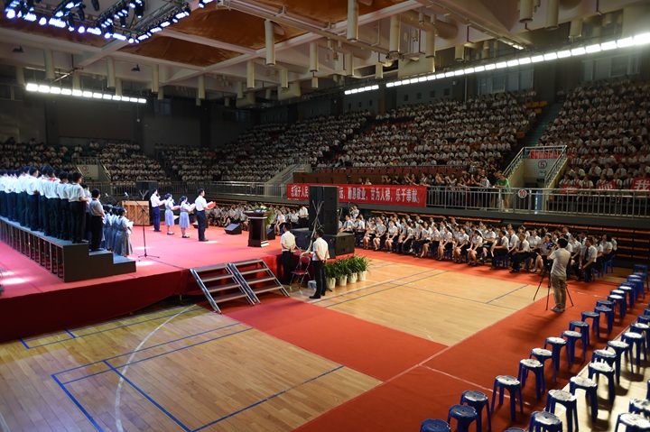 下午4:10,伴随着激昂的迎宾曲,在全体学生的热烈掌声中,龙校长带领着中学部全体教工步入会场。大会在嘹亮的国歌声中拉开了序幕。