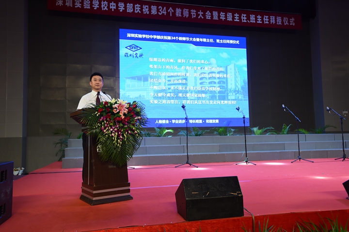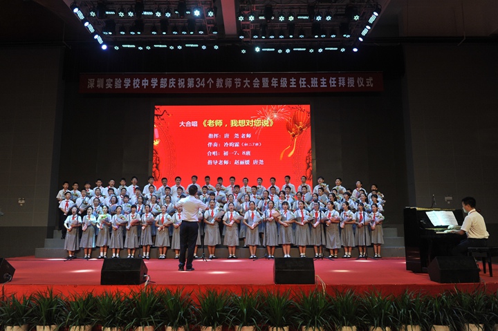 九月,一个收获的季节,一个感恩的季节,一个属于教师的季节。深圳实验学校中学部每年通过教师节庆祝大会暨年级主任、班主任拜授仪式,向我们无私奉献的老师献上我们最真挚的敬意,感谢老师的无私奉献,同时希望同学们能够把对老师的这份感激之情转化为今后学习的动力,学业有成,回报社会。