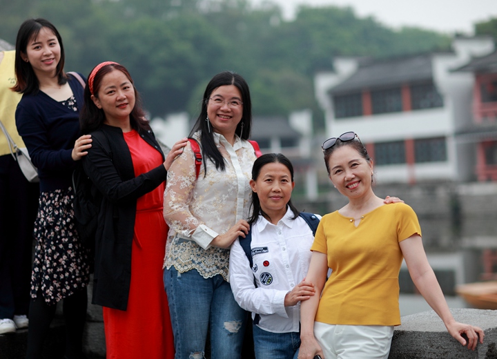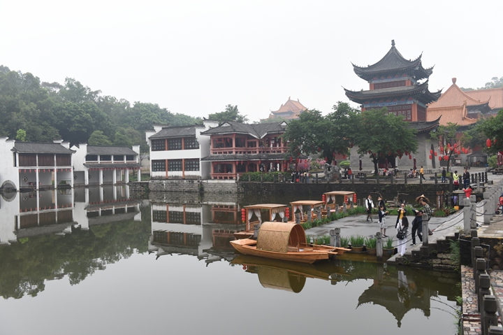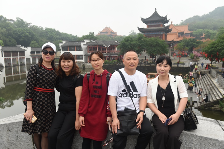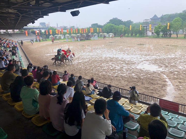 早晨8点从中学部准时出发,途经南沙大桥,领略其1688米的雄伟壮丽。上午11点到达有“中国好莱坞”美誉的南海影视城。城内所见,有真神圣天门的壮观,有小桥流水人家的静谧,还有“三英战吕布”的马战表演。牵绊住老师们前行脚步的,是其中古朴典雅的江南水乡:佳人驻足凝望,错落有致的青砖瓦房,古意古韵的小桥,多彩的油纸伞,瓦屋倒影。可能只有“水秀山清眉远长,归来闲倚小阁窗。春风不解江南雨,笑看雨巷寻客尝”来描述此刻的美景。