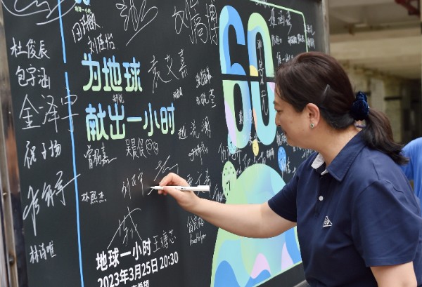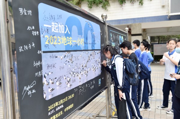 为更好的倡导师生减少能源消耗,减少碳排放,提高师生的环保意识,3月25日12时,中学部团委在校门入口西侧举行了“为地球献出一小时”签名活动。师生热情参与,支持环保,为保护自然贡献自己的力量。