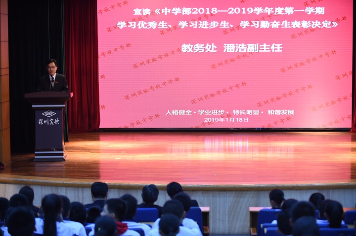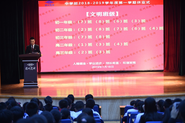 白驹过隙,时间飞逝。1月18日下午,中学部全体教师及各年级班级代表齐聚五楼小礼堂,举行2018—2019学年度第一学期结业式。大会由学生处高丽副主任主持。