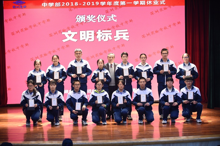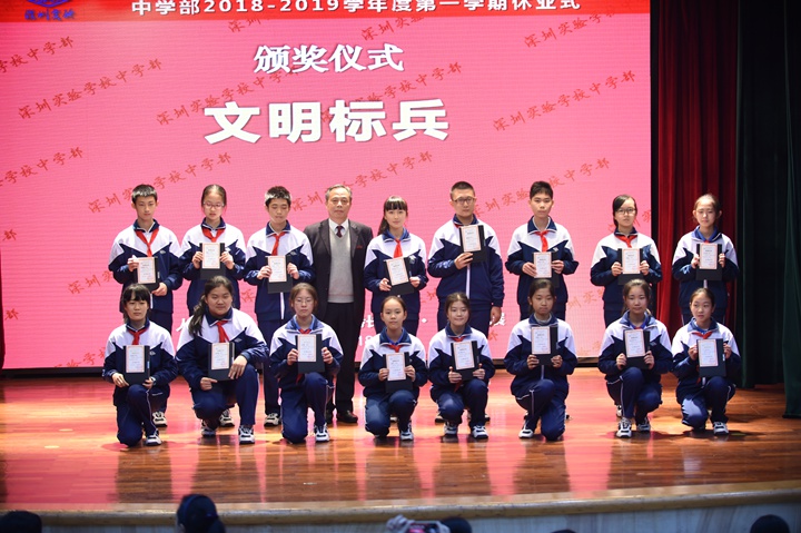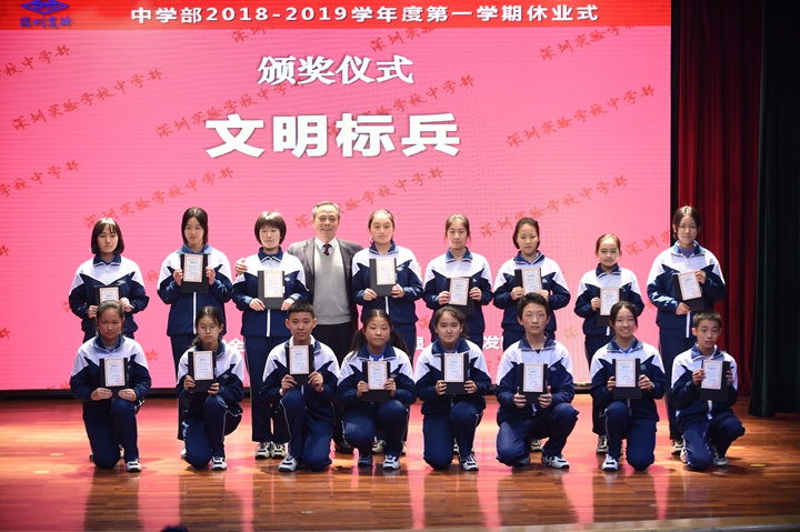 随后,结业式进入表彰环节。学生处杨宁副主任宣读本学期“文明班级”、“文明标兵”、“校长杯”篮球赛成绩以及“优秀学生常规管理干部”的表彰决定。教务处潘浩副主任宣读本学期“学习优秀生”、“学习进步生”和“学习勤奋生”的表彰决定。龙校长、杨光主任、王兵主任先后为在本学期表现突出、成绩优异、取得良好发展的班集体和学生颁发证书。