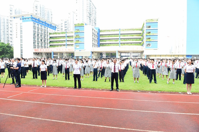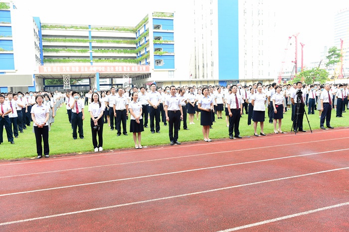 伴随着铿锵有力、整齐划一的脚步声,中学部国旗仪仗队擎起鲜艳的五星红旗护送到升旗台前。“升国旗,高唱国歌!” 五星红旗在全体师生的注目下缓缓升起,飘扬在实验蔚蓝的上空。