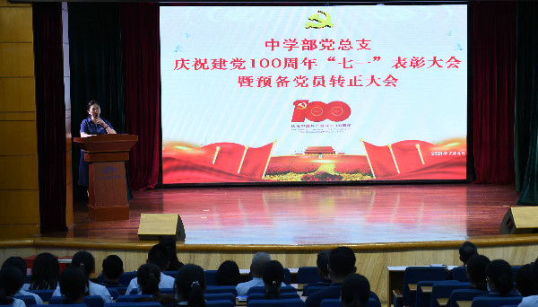 百年征程波澜壮阔,百年初心历久弥坚。建党百年,砥砺奋进,忆往昔,峥嵘岁月;看今朝,心潮澎湃。为庆祝建党100周年,不忘初心,牢记使命,中学部党总支于2021年7月6日16:00召开“七一”表彰大会暨预备党员转正大会。会议由靳军强委员主持,深圳实验学校党委副书记、纪委书记,中学部党总支龙萍书记及中学部全体党员出席大会。