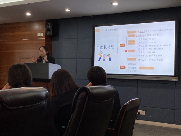 不久前荣获过广东省青年教师教学能力大赛一等奖第一名的优秀青年教师赵曼琳老师和唐丽艳老师分享了自己参加省级大赛的过程和感悟。赵曼琳老师认为,教学设计要全面而精细,“全面”是指拿什么教、教的是谁、教什么内容、怎么教以及教学反思都要全面关注;“精细”则是在教师活动和学生活动环节将设计意图中精准呈现,尤其是要突出学生的主体性。唐丽艳老师用思维导图概述了教学设计和要点,指出:不要忽略单元导言,要注意多种版本教材的对比;学情分析要从学生实际出发;教学目标要呈现出递进的关系;作业设计要有分层意识等等。