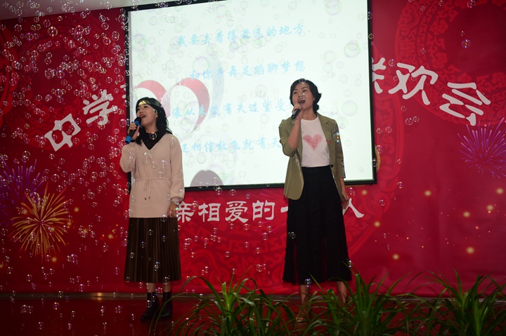 本次晚会不仅有语言类节目,还有歌曲类和舞蹈类节目。李珍和朱荣秀老师带来歌曲《咖喱欢乐中国年》,大家提前感受到假期的欢愉。唐尧老师带来独唱《贝加尔湖畔》,大家在美妙的歌声中体验到静谧清澈的世界。2020的本命年教职工的表演节目也别出心裁,“鼠鼠们”带来《夜来香》的演唱和舞蹈,音乐悠长、舞姿曼妙,尽显实验人的风采。表演结束后,龙校为“鼠鼠们”颁发“大红包”以表示祝福。
