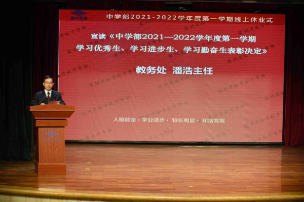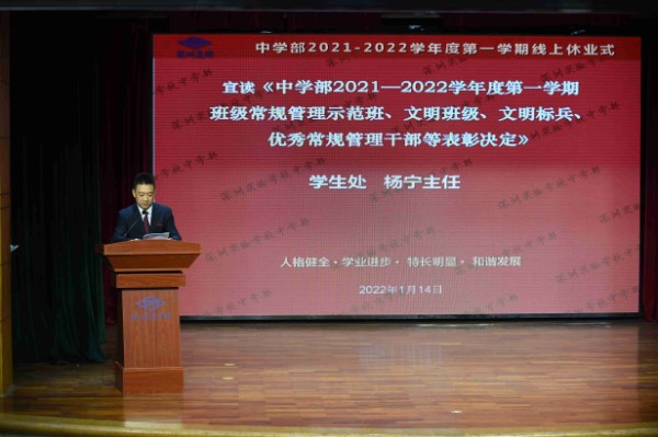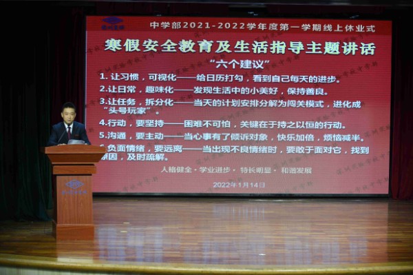 1月14日晚19点30分,中学部全体师生、家长准时收看中学部2021—2022学年度第一学期休业式,休业式采用线上方式进行。学生处高丽副主任主持。