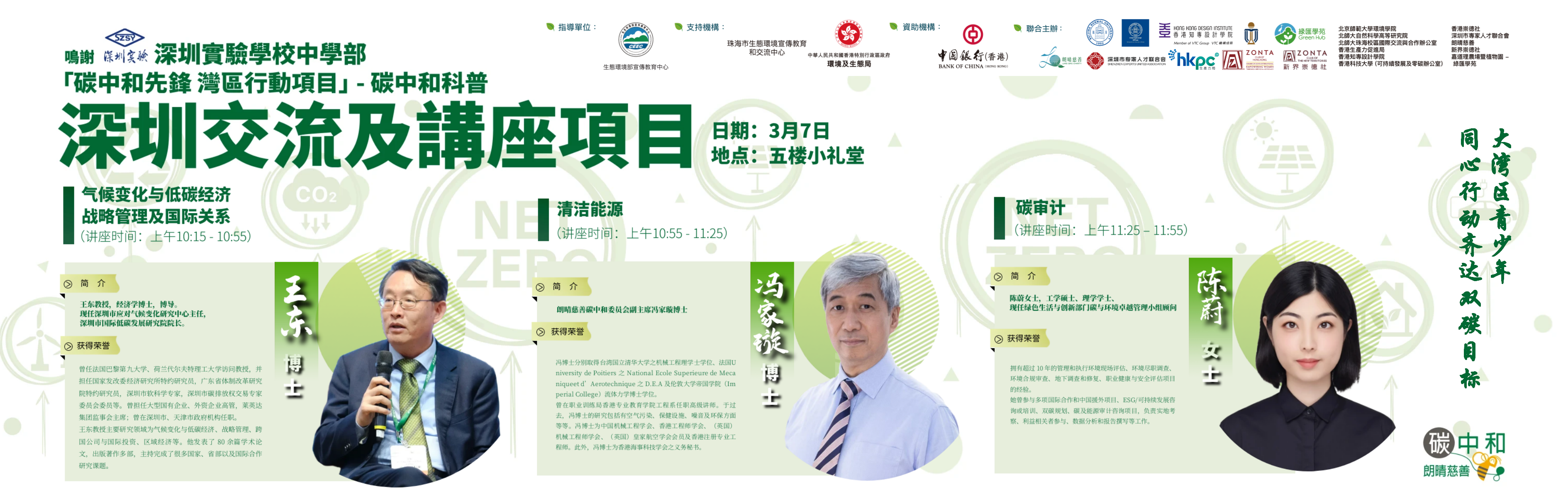 3月7日上午,“碳中和先锋 湾区行动项目——碳中和科普大湾区交流及讲座项目”在深圳实验学校中学部隆重举行。来自香港11所学校的师生代表、朗晴慈善代表、大湾区环保领域专家、政府机构代表与深圳实验学校中学部师生共聚一堂,围绕“碳中和”主题展开深度对话,以青春之力共筑湾区绿色未来。