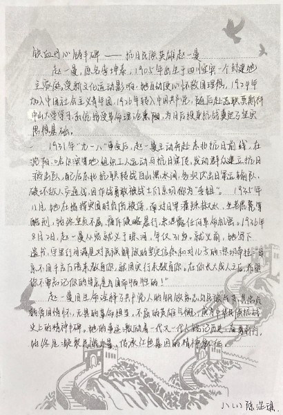 在班会课上,七年级每位同学怀着崇敬之情,给抗日英雄写下感情真挚的信件,表达对英雄们的深切缅怀和崇高敬意;八年级同学以班级为单位,完成抗日英雄人物小传的撰写;九年级同学举行了紧张激烈的“抗日战争”知识挑战赛。