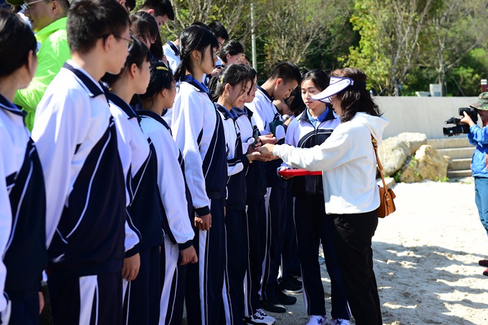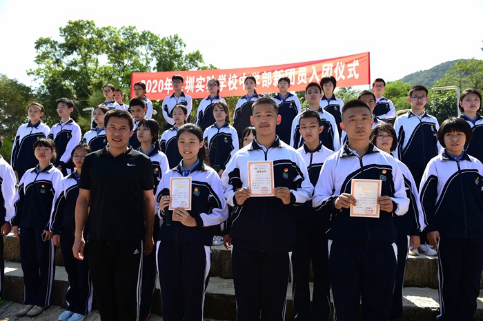 行军伊始,同学们一路欢歌。天蓝如镜,道路两侧红绿掩映,如入画中。随着紧凑的行军节奏,同学们步履匆匆,负重前行,坚决不掉队。历经十多千米的跋涉,师生们一行于12点左右到达了杨梅坑稍作休整。学生处和团委在此举行初三年级新团员的入团仪式,学生处杨宁主任和高丽主任为新团员颁发团徽,新团员代表高举右拳,庄严宣誓。胸前的团徽熠熠闪光,她将点燃青春,并激励同学们积极进取,砥砺前行。