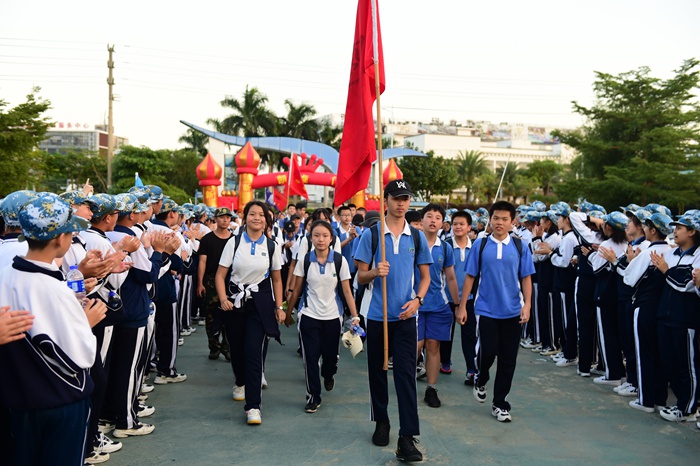 迎着夕阳的余晖,迈着坚定的步伐,在先期到达鹏城青少年基地的中学部初一初二年级同学们的热烈掌声中,初三全体师生意气风发,齐步穿越那道象征胜利的“凯旋门”,圆满完成了30千米的徒步拉练。