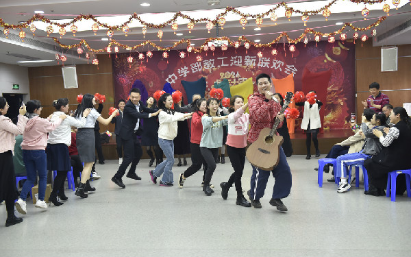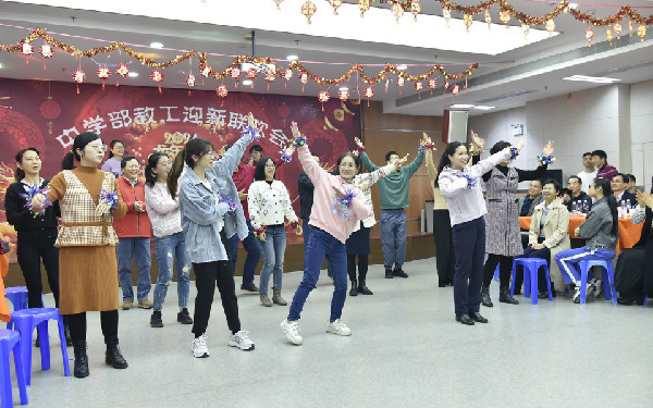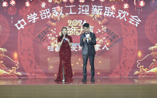 19点左右,全体教职工欢聚一堂,在西楼多功能厅隆重举行了迎新联欢会。晚会在主持人黄奕彤、范佳两位青年教师的激情开场中拉开了帷幕。随后,各个部门的教工轮番上演精心筹备的节目,为在座观众送上新春祝福。晚会过程中还穿插了趣味游戏,教工们热情高涨,积极参与,全体教工“玩”得尽兴,看得过瘾,也在忙碌的工作之余释放了压力,展现出青春昂扬的风采。