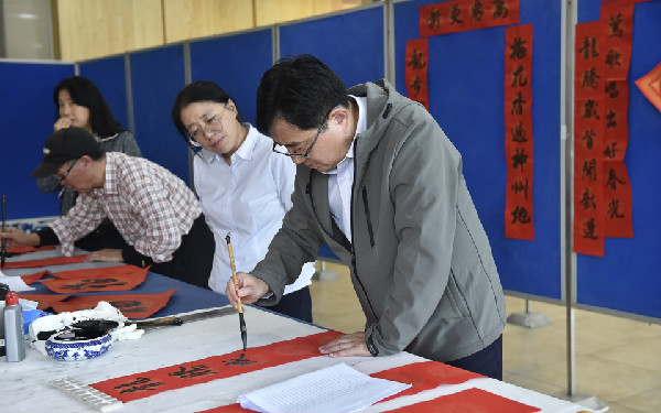 同一时间,退休教师李爱华受邀和美术教师高同宇一起挥毫泼墨,为教职工送福送春联,现场气氛热烈,供不应求。