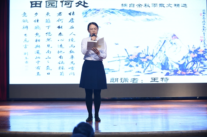 接下来,《余秋雨散文》的朗读与分享。首先,周笑老师朗读了《莫高窟》选段,带领观众走进敦煌,仿若眼前浮现了一幅幅精美绝伦的壁画,一尊尊风格迥异的雕塑,让观众为中华灿烂文化自豪的同时,更为痛失大量传世经书感到痛心。紧接着王特老师与大家分享余秋雨的《田园何处》,让观众体会享受到陶渊明之田园、余秋雨之安逸,也体味到“纵浪大化中,不喜亦不惧”的那份安定与从容。两位老师朗读结束后,曹李勇老师与大家分享《余秋雨散文》的读后感,他针对城市与人的关系进行了深入切实的思考,用自己的切身体会细谈了人与城市的那份特殊感情和纽带,呼吁观众们用心融入所在的城市,并带着骄傲与自豪努力去成为这个城市闪亮的名片。
