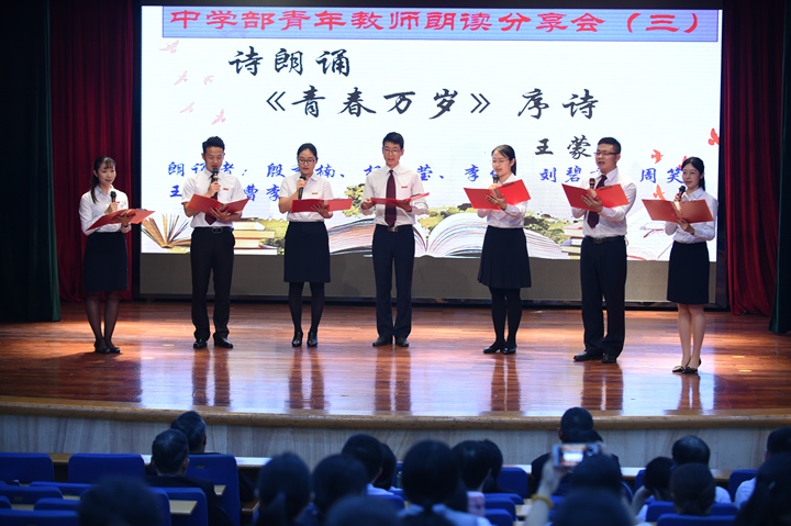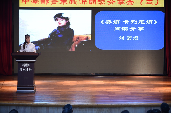 2018年11月30日下午4:10,深圳实验学校中学部在五楼小礼堂举办了第三期青年教师朗读分享会,七位青年教师针对《安娜·卡列尼娜》和《余秋雨散文》两本书进行了朗读与读后分享。主持殷秀楠、杨韵莹两位老师。
