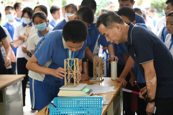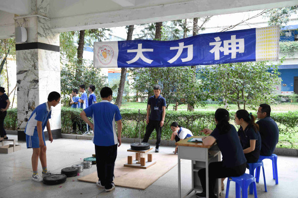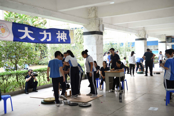 在中学部一楼中厅进行的是初二年级“大力神”比赛。赛前,同学们反复琢磨,用心设计,用一根根小木条制作成集美学和力量于一身的木框架结构。哪组同学的框架结构设计最合理,能承载最大的重量呢?同学们手中的框架结构俨然成了“大力神”,即将接受承重测试。比赛中,同学们小心翼翼地将一个个不同重量的砝码叠放在“大力神”上,场上所有人的目光也都聚焦在“大力神”上。当“大力神”坍塌的那一刻也是其承重极限,也是其最高光的时刻,同学们为之欢呼和鼓掌。在学习生活中,我们也应该像“大力神”一样,突破自己,以求多承载一份重量。