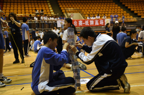 文体馆里,初一、初二年级的同学进行了“纸桥承重”和“纸牌高塔”两项比赛。进门靠右侧的区域,同学们进行“纸牌高塔”的比赛。比赛伊始,各班选手迅速分工,一人灵巧地裁剪着纸牌,另一人小心翼翼的拼装。随着纸牌塔越堆越高,选手们屏气凝神,动作更轻柔了,生怕碰倒自己倾力打造的作品。整个过程既考验同学们的合作,更考验默契。文体馆的另一侧是“纸桥承重”比赛。同学们必须当场在规定时间内完成纸桥的制作,并在上面放置砝码进行测试。测试前,各班选手精心设计,并在桌上利用打印纸等材料制作,不一会儿就完成了各具特色的纸桥。砝码放置测试是最激动人心的时刻,两位选手目不转睛地盯着纸桥,生怕错过纸桥的任何一点变化。纸桥的跨度不断拉长,选手和观众的心弦却不断收紧,担心沉重的砝码会压塌那纸桥。
