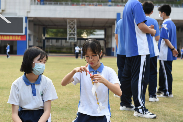 绿草如茵的足球场上,初一年级参加“飞向天空”比赛的同学在划分好的比赛区域按班级就坐。天清气朗,选手们早已准备就绪,蓄势待发。有的选手还在利用候场时间不断调试自己的“飞机”,将飞机上的橡皮筋缠绕数回,为自己的飞机加足马力,以求自己的飞机能在空中停留尽可能多的时间。随着一声令下,一架架飞机在绿茵场上空中划过一道道优美的弧线。