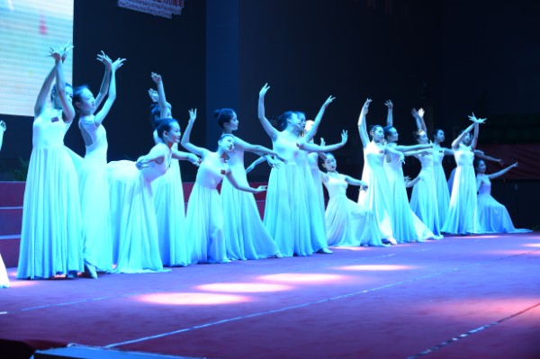 最后,学生合唱团大合唱《再一次出发》昭示着我们在党的旗帜下再出发,乘风破浪,再创辉煌,整场汇演也推向了高潮。伴随着激昂、高亢的旋律,校领导、各部教师代表走上舞台,和全体演职人员合影留念。