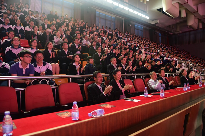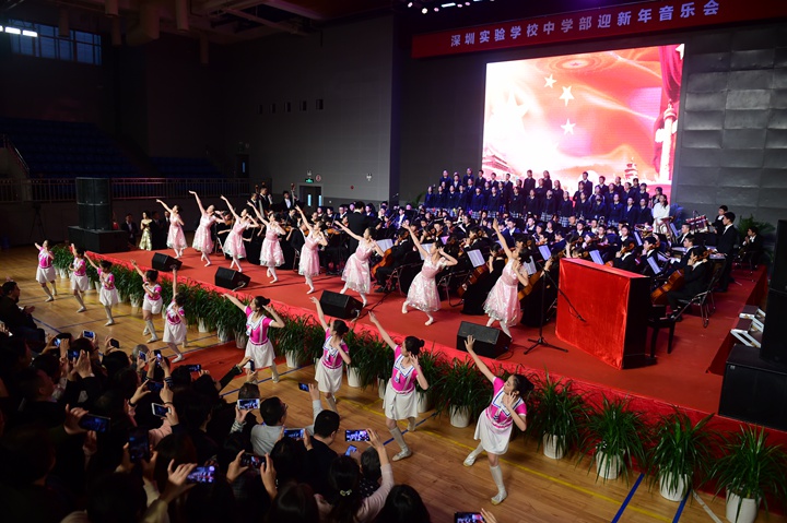 飞扬的歌声,唱响难忘的岁月;青春的旋律,演绎时代的激情。2019年12月20日下午4时,中学部迎新年音乐会在文体馆拉开序幕。在这书声朗朗、郁郁葱葱的校园,中学部全体师生和部分家长代表欢聚一堂,一同走进音乐的圣殿,一同聆听动人的旋律,体味经典的美妙。恰逢澳门回归祖国20周年、新中国70周年华诞之际,深圳实验学校学生交响乐团、中学部合唱团、舞蹈队同台挥洒梦想与才华,共同为我们演绎了一场精彩绝伦的艺术盛宴,用青春的气息,绽放美好华章。衷敬高校长、龙萍副校长、冯维丹副校长出席了本次音乐会,音乐会由初三(6)班刘润可同学主持。