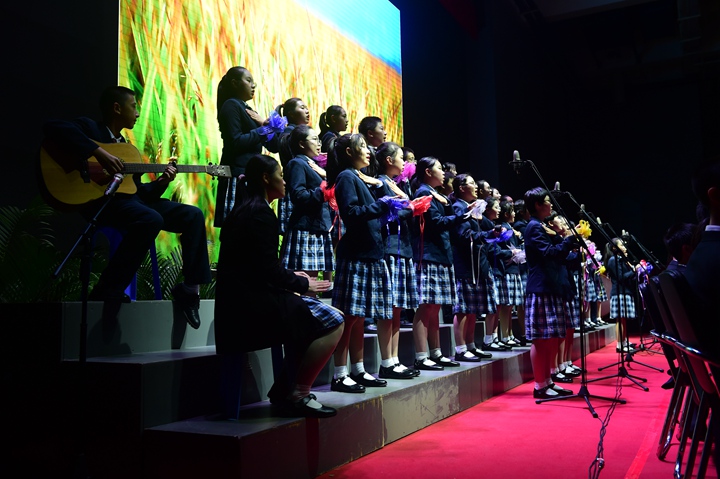 稻草人、萤火虫、童年的纸飞机,妆点着乡村少年童话般的歌谣。刨去浮躁,清纯的感情、清雅的追求弥足珍贵。指挥唐尧老师、钢琴伴奏初二(6)班沈乐熙、吉他初一(6)班黎俊峰、非洲鼓初一(6)班孙嘉慧,中学部合唱团通过一首《稻香》勾起我们心中那段久远却美妙的童年记忆……