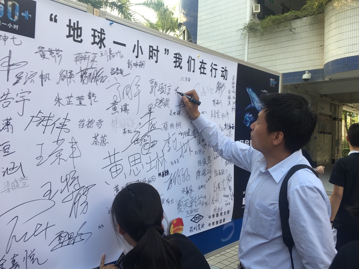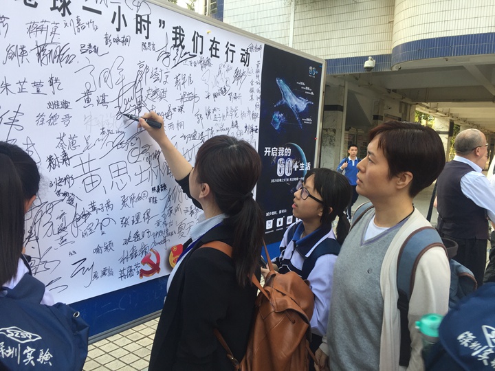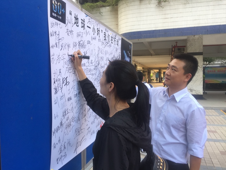 团委、学生会的成员身穿义工服以及“地球一小时”活动服装,向师生、家长宣传、传递着环保理念。中学部党员老师积极参与此次活动,并在签名版上写下自己的姓名和愿望,表达参与维护地球行动的意愿。中学部党员刘春风老师现场向学生讲解宣传“地球一小时”活动的意义,倡导爱护环境、绿色出行的理念;学生及在场的家长也积极参与,为环保贡献一份力量。现场气氛热烈,环保理念在布满签名的板上体现得淋漓尽致,每一个签名都代表着师生、家长对地球-——我们的家园的关心与呵护。