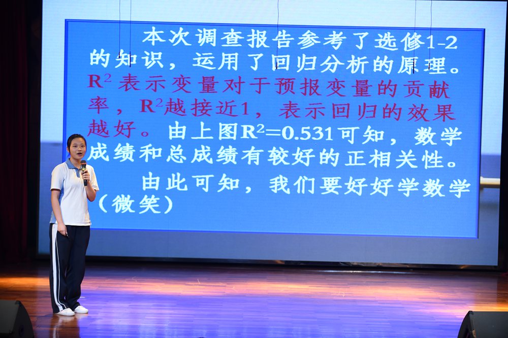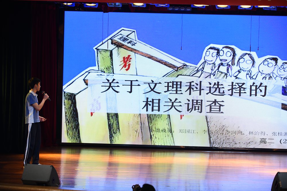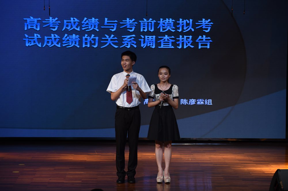 高二年级的理科同学,围绕“高考成绩与考前模拟的关系”、“高中生理想大学”与“学习成绩的各项因素”以及“中学生近视情况”、“网购”、“文理科的选择”展开了详细的调查,其作为理科生特有的严谨逻辑思维,让现场掌声不断。