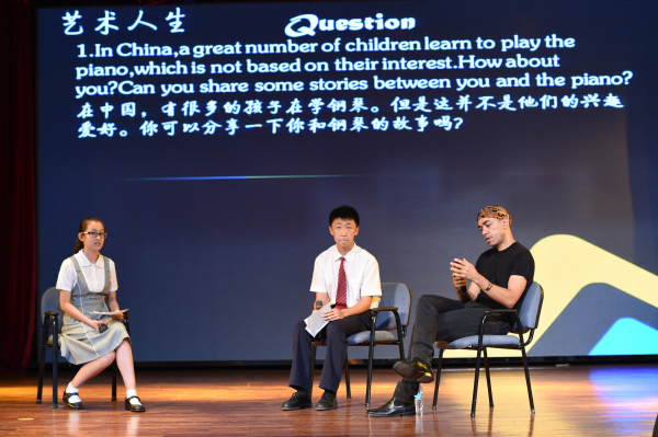 马克说他很喜欢中国文化,现场他把自己写的书法作品向大家展示,宣纸上一个个行云流水般的方块字凝聚了一个外国人对中国文化的尊重与陶醉,我们都为他的书法惊叹。接着他向大家分享推荐了自己最喜欢的十本书,《米诺》《善恶的彼岸》《道德经》……台下的同学也踊跃的与马克分享自己的读书感悟,现场处处都闪现着智慧碰撞的火花。接着,他送给同学们一首自己创作的钢琴曲,其中融入了数首世界名曲旋律的片段,在场的同学无一不被他高超的技艺和表现力所感染。