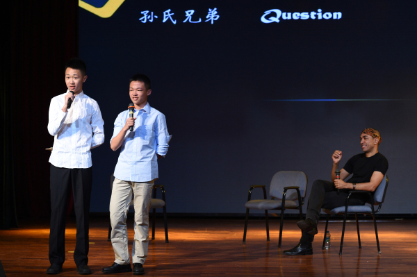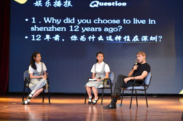 接着,报告会进入访谈环节,初二年级各班代表组成的特色访问组分别命名为“艺术人生”,“娱乐播报”,“孙氏兄弟”,“焦点访谈”,他们向马克先生提出了同学们关心的各个领域的问题。在问到“对于乐器考级的看法”时,他铿锵有力地说:“跟随你的爱好去做每一件事,每一件事就都能做好!”;问到他的中国妻子时,他的脸上浮现出甜蜜的笑容,和我们分享起那段往事;马克先生也详细地为我们讲述了他的基金会公司是用公司的运营形式管理基金会,基金会本身不是赚钱为目的,是以文化交流、帮助他人为目的的(The Mark Obama Ndesandjo Foundation Limited)。通过有趣的访谈环节,同学们对于马克的认识也更近了一步。