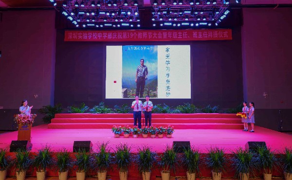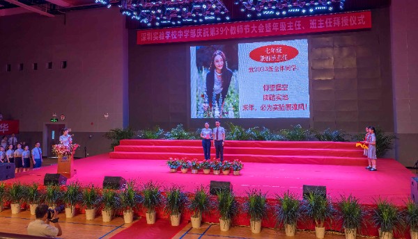 九月的天气虽然让我们的日常变得捉摸不定,但也无法改变我们对教师节坚定的节日信念。原定于9月8日在中学部文体馆举行的中学部庆祝第39个教师节大会暨年级主任班主任拜授仪式因为暴雨停课而推迟到了9月11日。即使时间延后,但现场的学生、老师和家长们依然在活动中收获到丰富的体验。