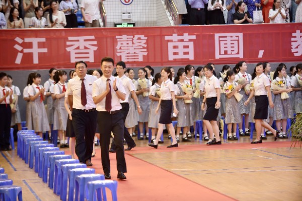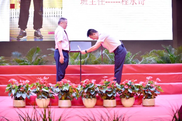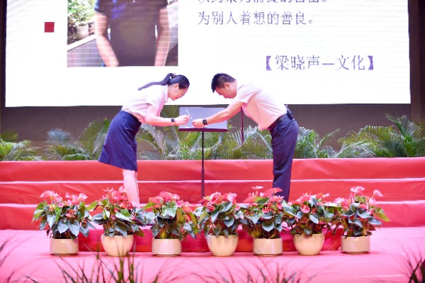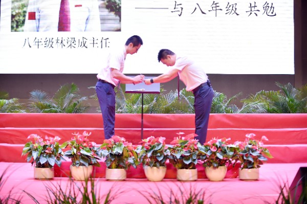 随后是活动最庄严的年级主任班主任拜授仪式。三个年级的年级主任和班主任们依次上台,接受全面主持中学部工作的杨宁主任的拜授。一句句“拜托了”,一声声“请学校放心”,让现场的学生和家长们都感受到了学校对老师们的殷切重托与深切信任,体会到了老师们对职业使命的郑重承诺和坚毅担当。