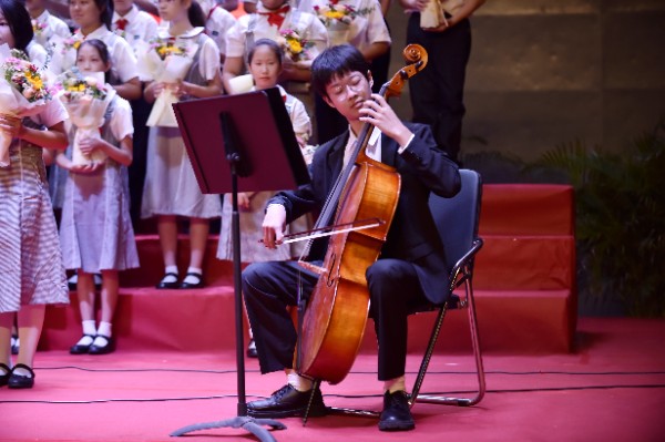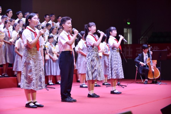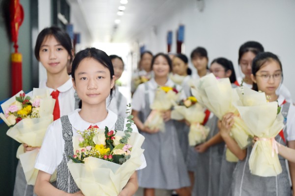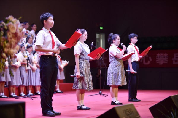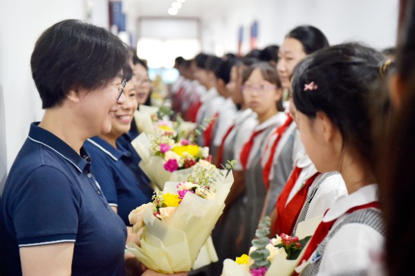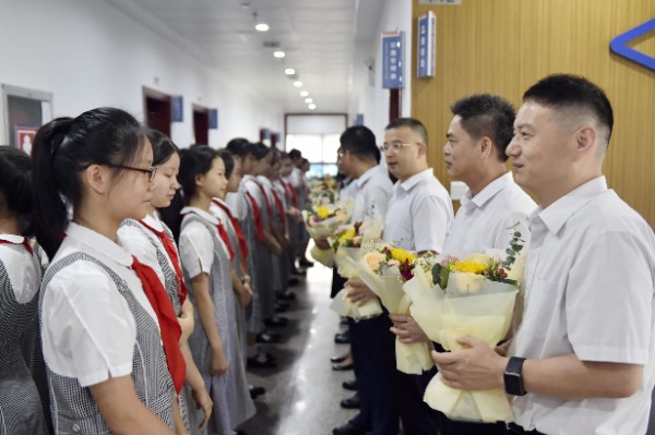 一朝沐杏雨,一生念师恩。拜授仪式后,由八年级和九年级学生代表为老师们献上诗歌朗诵《九月赞歌》,由七年级1班和2班学生为老师们带来歌曲《所以少年人》。全场在激昂的诵读声和舒缓的歌唱声中汇成了感恩的暖流。在此刻全场氛围达到顶点时,每位老师也接受到了学生代表的献花。花香飘溢,师恩永存。活动最后在全场对实验校歌的整齐合唱中结束。
