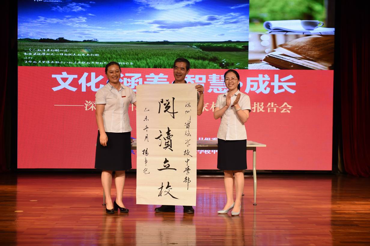 对于中学生而言,传承中国文化是我们的责任,解开文化中的冲突也是我们的职责。文化在于教育,在于自身的思维醒悟。杨老师即兴挥毫“阅读立校”四个大字,现场掌声雷动。