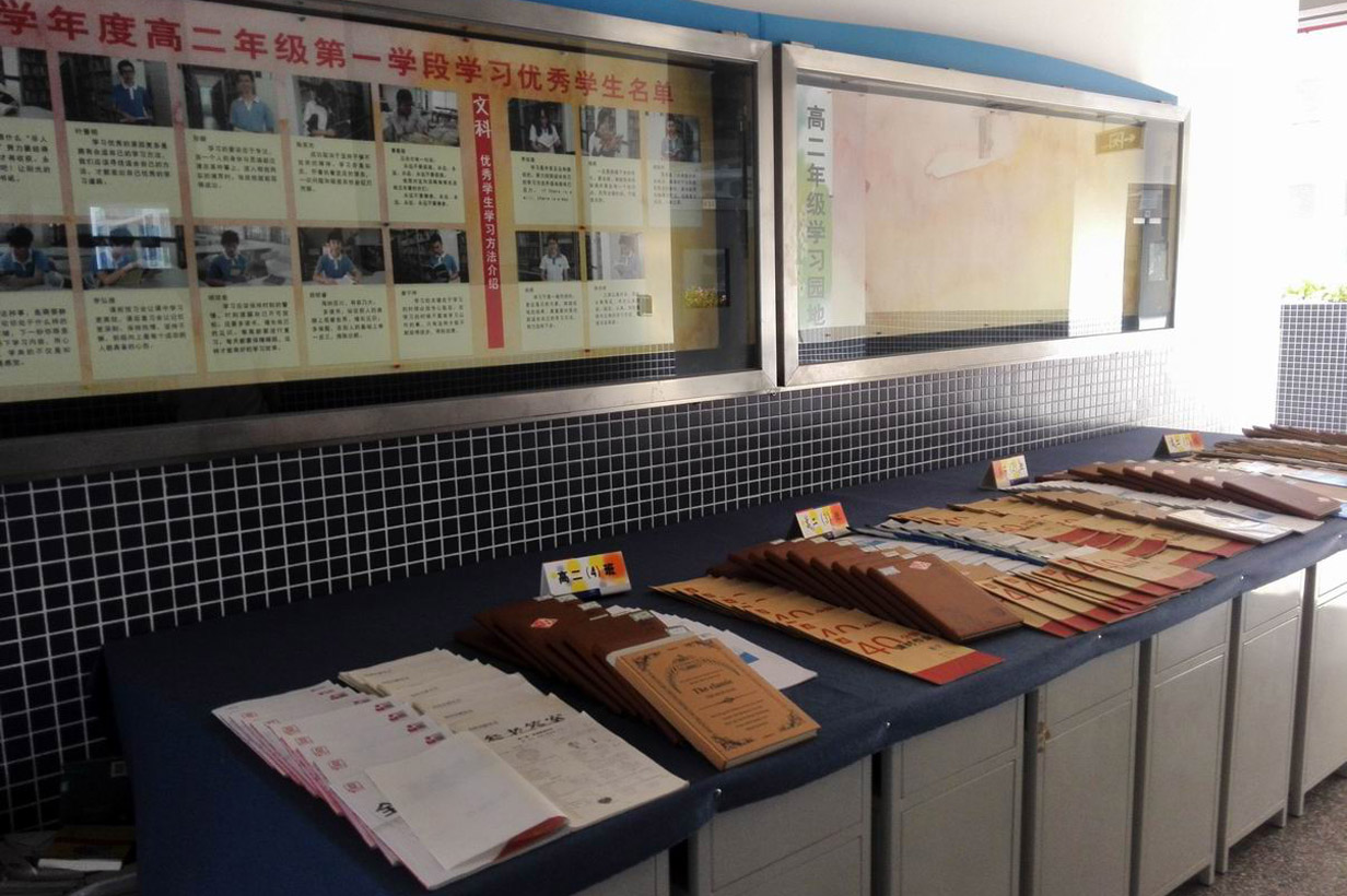 “学生硬笔书法优秀作品展”。各年级学生富有个性地展示了良好的汉字书写水平,工整大方,遒劲有力。初一初二的英语、汉字书法犹如稚鹰初展;初三年级以国学为背景的书法纸上唐宋诗词尽显风骚;高中年级书法已趋成熟、大气、漂亮。中学部每天固定的习字时间让一届又一届学生收获满满。