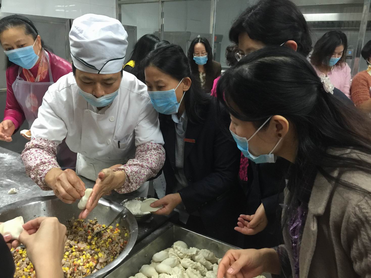 在中学部工会的精心组织和安排下,教工们来到后厨,分别选择自己的拿手活计,拌馅、擀皮、包饺子、摆盘,过程中大家互相交流饺子样式,学习新式包法,其乐融融。不一会儿各式各样的饺子就呈现在大家眼前,师傅们也忙着检查指导,很是认真。
